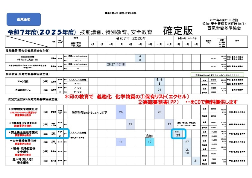 2025年10月29日協会からのお知らせ 【1月講習案内】49名以下対象 安全衛生推進者養成 2026年1月22,23日残席25 ①安全経営あいちに賛同できます②1年内に形にできる化学物質管理のCDを無料配布します