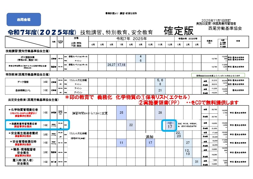 2025年11月03日協会からのお知らせ 【12月講習 実施日変更】 保護具着用管理者 変更前12日㈮➡変更後12月17日㈬ にししん文化会館 変更のお知らせ 保護具着用管理者講習 変更前 12月12日金曜日 変更後 12月17日水曜日 よろしくお願いいたします。 11月2日 西尾労働基準協会