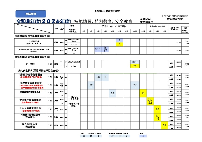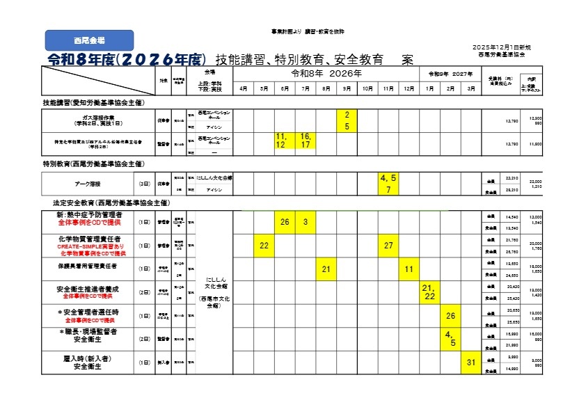 【来期計画】来期2026年度 西尾会場 講習会計画(案) 新設は熱中症予防者教育