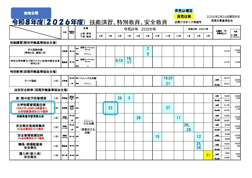 2026年02月26日協会からのお知らせ 【西尾講習会3ケ月前案内】 化学物質管理者2026年5月22日㈮にししん文化会館 ※クリエイトシンプル実習あり ※保有リスト作成が早くできるエクセル事例をDVDでお渡しします